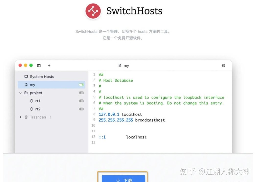 打开下载地址 https://switchhosts.vercel.app/zh,下载指定系统版本的 switchhosts 并安装运行。