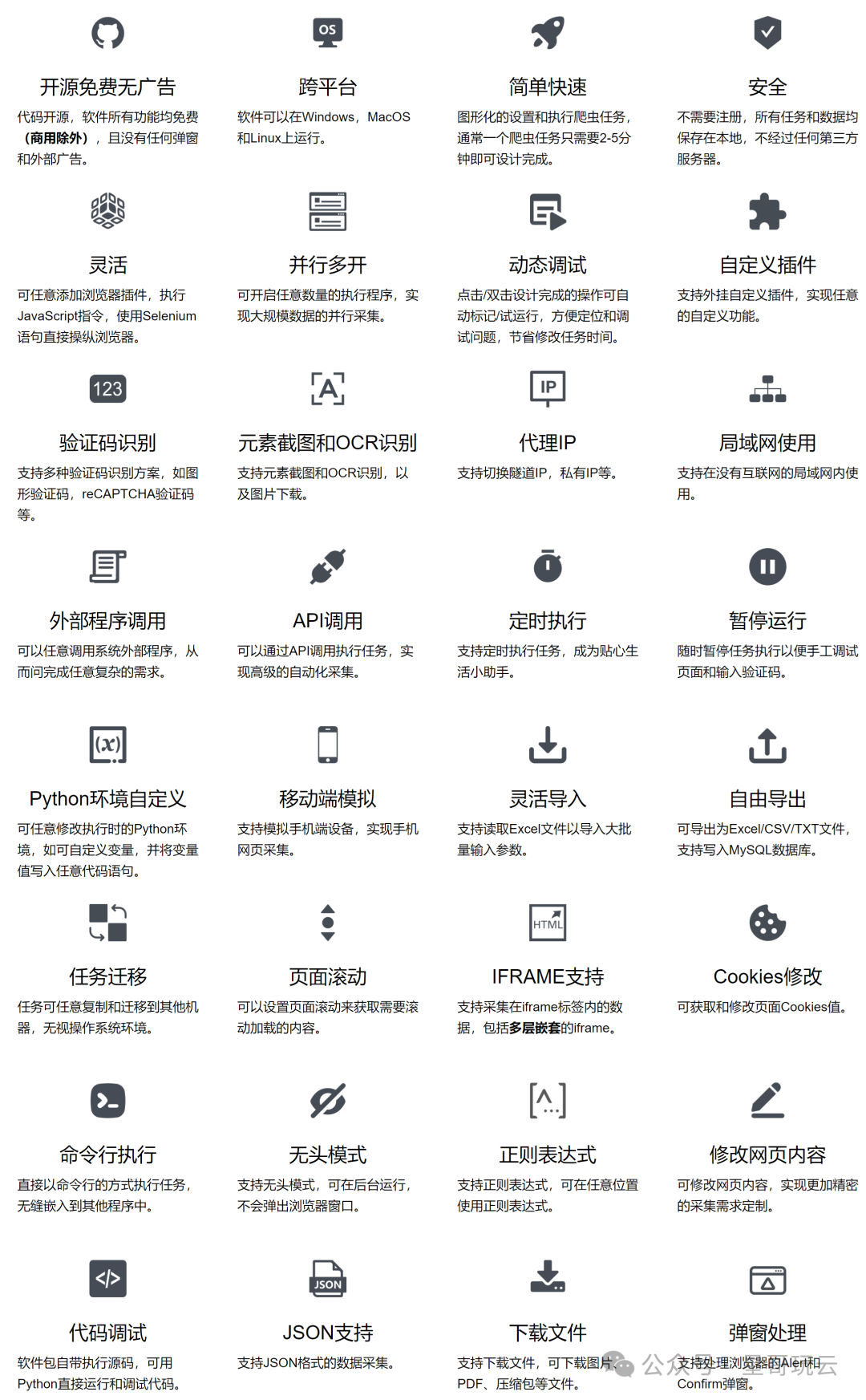什么是EasySpider一个完全免费(包括商业使用和二次开发)的可视化浏览器自动化测试/数据采集/爬虫软件,可以使用图形化界面,无代码可视化的设计和执行任务。只需要在网页上选择自己想要操作的内容并根据提示框操作即可完成任务的设计和执行。同时软件还可以单独以命令行的方式进行执行,从而可以很方便的嵌入到其他系统中。 软件特性如图。