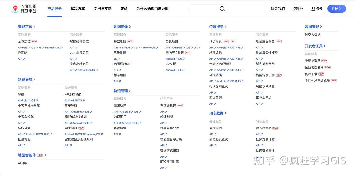 1.2 优势高德地图开放平台是目前业内使用最为广泛的地图API之一,也是一个开发者使用起来体验感很好的API。无论是在地图API的功能方面,还是各功能对应的使用方法、接口文档、帮助社区建设等方面,相对均较为成熟。 1.3 不足高德地图的感兴趣点(Point of Interest,POI)数量不足百度,在使用过程中会受到一定影响。 此外,国内部分地图开发者论坛也有提到,高德地图开放平台有时存在产品或服务规则短时间内出现较大变化的情况——例如,突然强制为所有免费用户的地图添加平台水印、未提前通知而迅速关闭部分云服务导致开发者长期心血白费需要重来等情况;这些亦需多加注意。 2 百度地图开放平台2.1 功能其官网对各功能的展示如下。 ![]() 可以看到,百度地图开放平台的功能是几家中最丰富的,提供了包括定位、导航、遥感数据、轨迹、位置搜索、动态数据等地图服务工具;且还提供了具有智能分析作用的时空大数据模块、地图智能体等,是几家不同地图API中,对时空智能分析、AI技术等最早加以应用的厂商之一。总的来说,百度地图开放平台对于开发者而言可以说满足了几乎全部的地图服务需求。