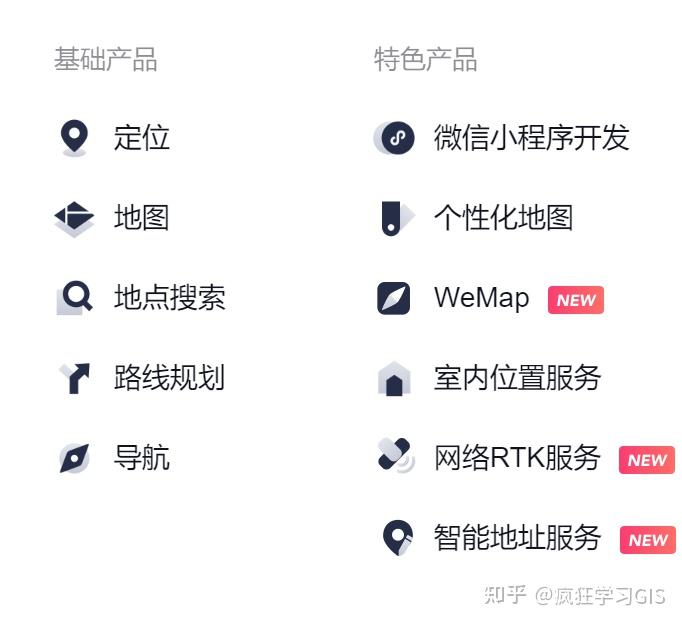 并且最近一段时间,百度地图开放平台还对其自身的开发文档做了进一步完善,包括API调用模块,近期也升级了示例中心,文档更完善、调用更便捷;同时,其检索功能也升级到了3.0版本,支持深度检索,提升开发效率。 2.2 优势百度地图可以说是百度家的老牌应用了,所以百度地图开放平台也在不断的更新迭代中,成为国内首选的地图API之一。百度地图开放平台还有一个比较大的优势在于其支持全球服务,即国外地图;对于需要涉及国外地图服务的应用场景而言,同样是最首选的API。 除此之外,对于国内服务的需求,百度地图最大的优势在于其数据储量较为丰富——这里的数据储量包括与商业相关的地图要素,例如各类POI等,据说其他地图API暂时都无法与其匹敌。 整体而言,在国内常见的软件、网页或小程序开发中,百度地图开放平台就是数一数二的存在,可以满足几乎全部的开发、应用需求。同时,百度地图在to B方面亦非常强大,雅迪、华为运动手表、滴滴货运、京东物流、银联等很多耳熟能详的品牌,都在用百度地图的服务。 2.3 不足有一个算不上是不足,而属于需要注意的一点:百度地图采用的是百度坐标系(BD09),而非火星坐标系(GCJ-02),需要做转化。但是百度官方全面支持坐标转化,不需要有数据坐标转换、精度方面的担心,可以直接使用。 ![]() 3 腾讯位置服务3.1 功能其官网对各功能的展示如下。 ![]() 其中,包括以下常用功能。