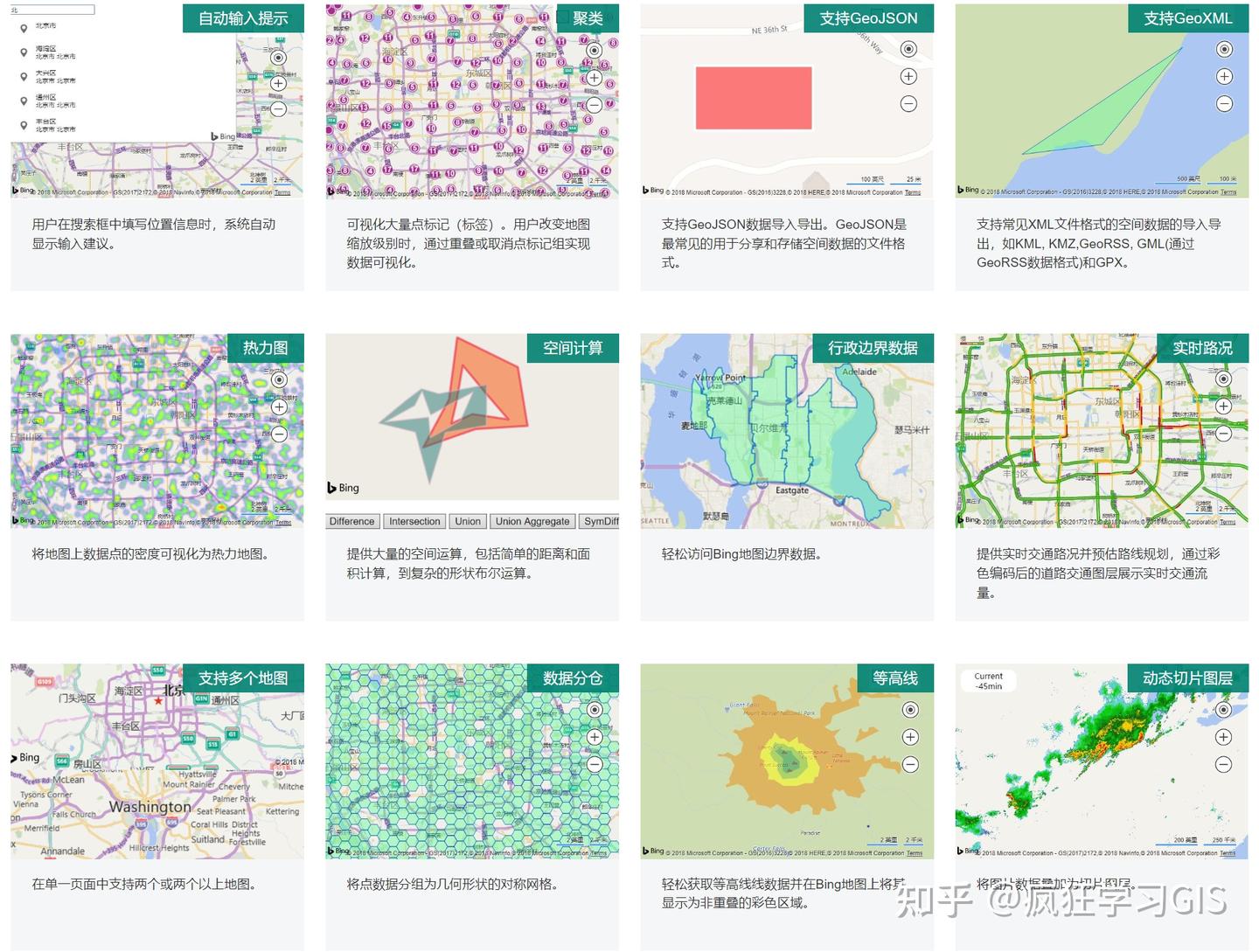4.2 优势必应地图API我个人感觉其重心是在地图数据分析上。其官网并没有对定位、导航等基础地图应用需求有过多介绍,反而是对热力图、空间计算、聚类等空间分析算法加以一定篇幅的表述。对于需要涉及空间分析、地图数据计算等的应用需求,基于其API或许整体相对较为理想。 4.3 不足作为非国内地图API,不得不说无法完全保证必应地图的各类数据符合国内相关规定——虽然他们在国内亦有较大的to B用户,按道理数据肯定也是符合审查规定的;但是相对而言,或许还是不如本文所列其他 而且整体来说,无论是从数据安全、服务质量、接口稳定性,还是国内开发者的应用生态等不同角度考虑,对于当前主要瞄向国内市场的应用、网页而言,我感觉没必要选择国外的地图API——即使真的有较多国外的地图数据需求,那也可以通过百度的全球数据来实现,没必要因此直接使用国外图商的数据。 5 天地图API5.1 功能其官网对各功能的展示如下。 其中,包括以下常用功能。