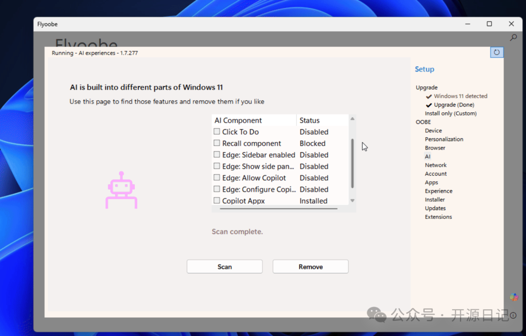 Flyoobe 是一个开源工具箱,专为解决无法在“老电脑”或“硬件不支持”的 PC 上安装 Windows 11 而打造。早期版本 Flyby11 专注于绕过硬件限制,而升级后的 Flyoobe 更是一键集成了系统优化、去预装应用和定制化功能,简直是专为操作系统折腾达人量身定制的装机神器。
