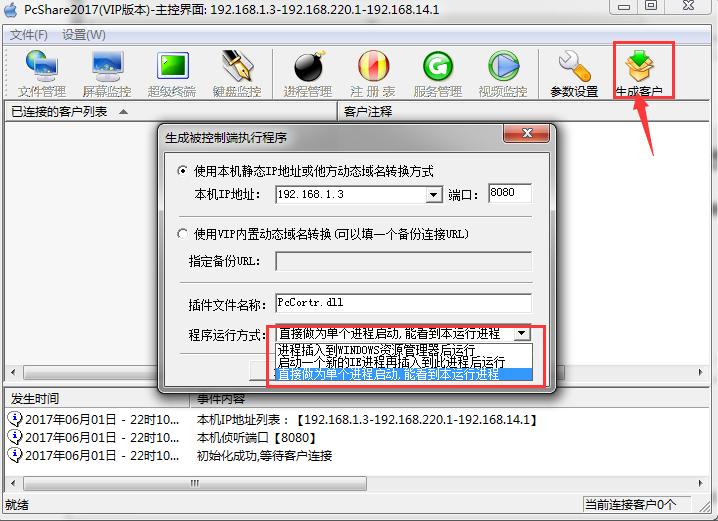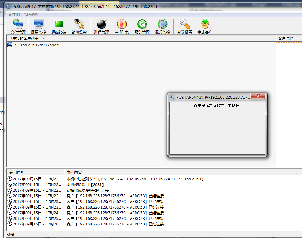 界面预览开始页: ![]() 监控和操作别人电脑: ![]() 查看和操作被控制电脑的进程: ![]() 查看被控制电脑服务程序: ![]() 如果别人电脑有摄像头,还可以打开监控摄像头: ![]() 操作介绍一、软件使用方法介绍: