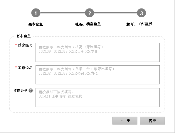 图7 x 拆分后的页面2:社保档案信息录入 最后来到了步骤三,如图7-x。 在教育经历、工作经历的文本框中,用淡灰色文字做了格式要求的示意,这并非强制要求,但通过提示,希望用户尽量能按照清晰地逻辑结构描述相关信息,否则用户填写的方式,绝对五花八门。