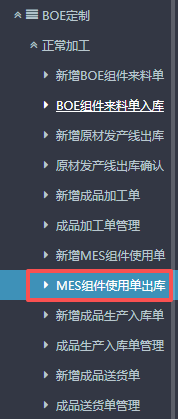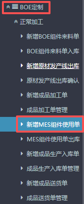 1.进入ERP系统之后,在左侧功能菜单里找到“BOE定制”,点开后点击“正常加工”,找到“新增MES组件使用单”