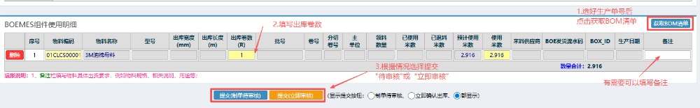 • 4.选好单号后,按照图中进行操作:先点击右边的“获取BOM清单”,填写“出库卷数”,然后根据情况选择“提交制单待审核”“提交立即审核”。