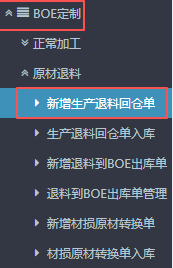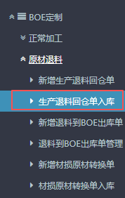 1.进入ERP系统之后,在左侧的功能菜单里找到“BOE定制”,点开“原材退料”,点击“新增生产退料回仓单”。