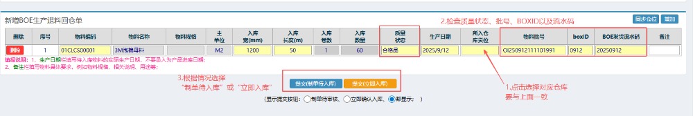 4.选好物料之后,按图操作:点击选择对应入库货位(要与上面一致),检查物料的质量状态BOXID以及流水码