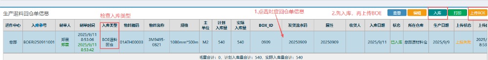 7.接着来到下方界面,按图操作:点击对应的回仓单信息,先进行入库操作,然后再上传BOE
