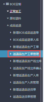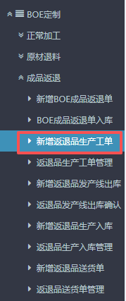 1.进入ERP系统之后,在左侧的功能菜单里找到“BOE定制”,点开“成品返退”,点击“新增返退品生产工单”。