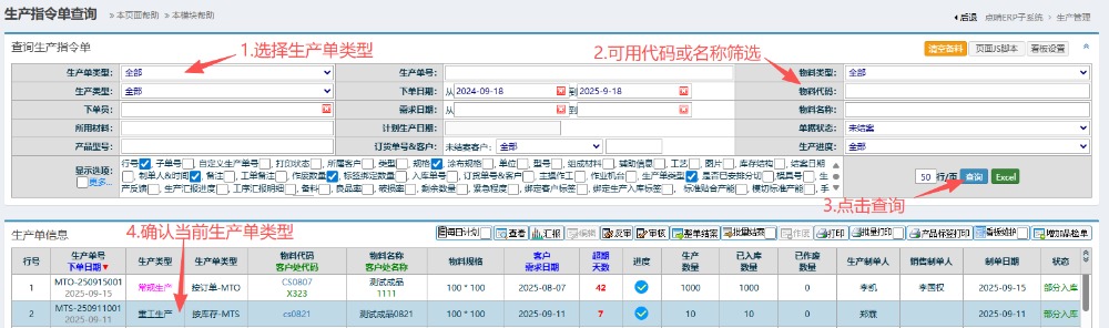 6.进入界面后,按图操作:选择生产单类型,可用代码或名称筛选。点击查询确认当前生产单类型