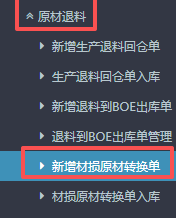 4.提交后,返回到左侧的功能菜单,找到并点击“材损原材转换单入库”