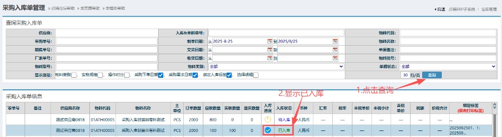 10.回到“采购入库计划及打印标签”页面,再次点击查询,可以看到刚才扫码的物料已经成功入库了。