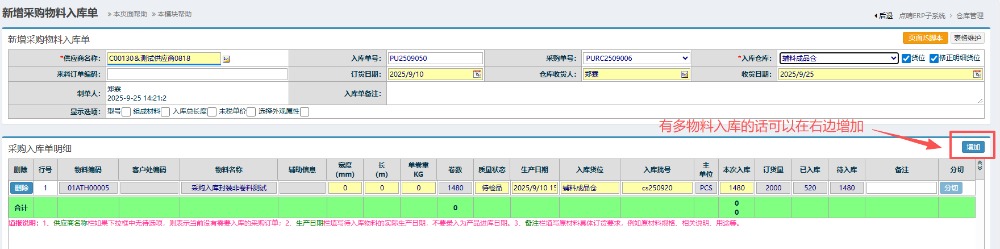 进入入库界面,先选择好入库仓库,然后确认好物料的入库数量、订货量和日期,点击提交待审。 有多物料入库的话可以在右边点击增加。