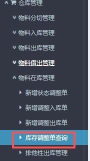1. 进入ERP系统之后,在左侧的功能菜单里找到“仓库管理”,点开“物料在库管理”,点击“库存调整单查询”。
