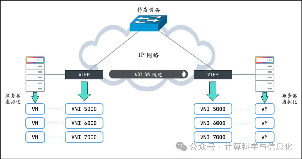 VXLAN 为服务器虚拟化提供了灵活的网络扩展能力。它通过 VTEP(虚拟隧道端点) 将虚拟机的二层流量封装在 UDP/IP 报文中,使虚拟机可以在三层网络范围内自由迁移,同时保持网络策略不变。结合 VNI(虚拟网络标识),VXLAN 能在同一物理网络上创建多个隔离的虚拟网络,满足多租户需求。这种技术使云计算平台(如 OpenStack、VMware)能够动态调配虚拟机,突破传统 VLAN 的数量和地理限制,实现高效资源管理。