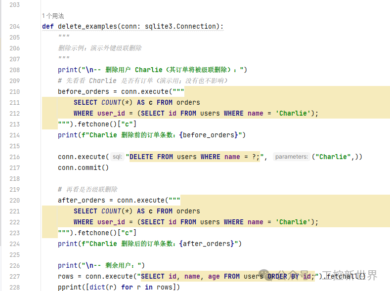 函数6:def delete_examples(conn: sqlite3.Connection):