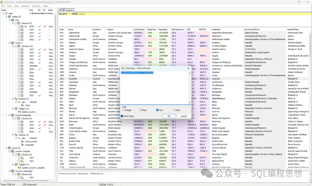 SQLiteSpy 基于 Delphi 语言开发,目前只支持 Windows 平台。 功能特性