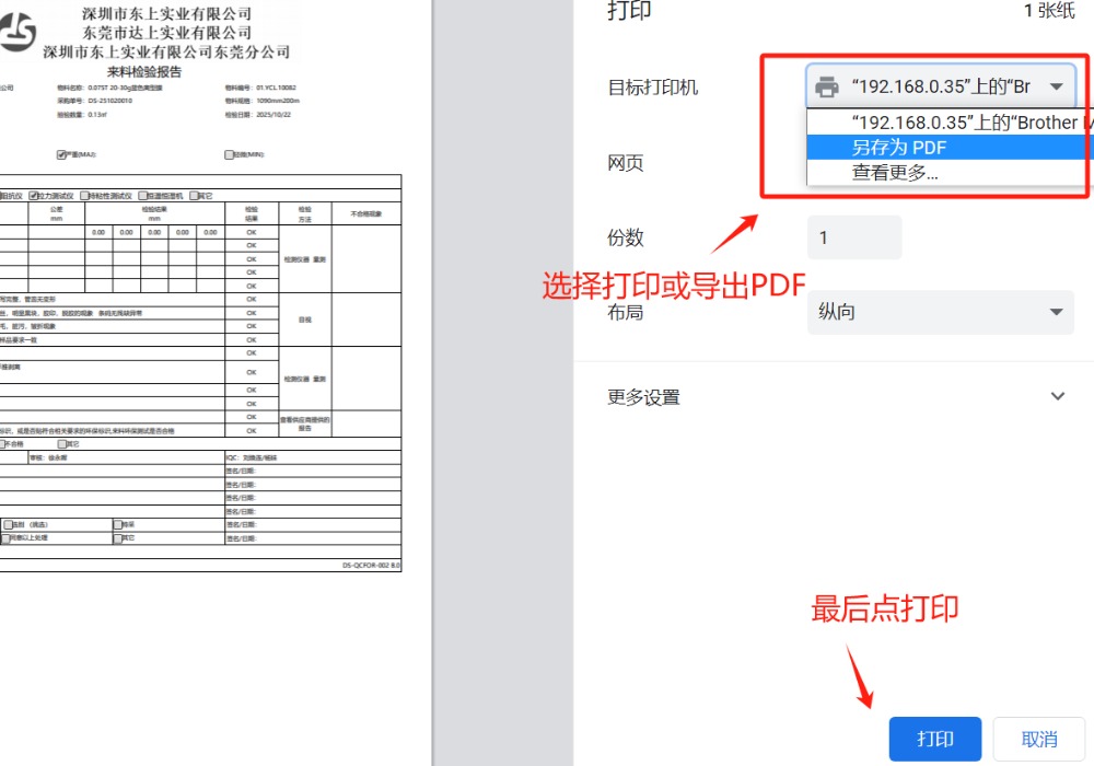 然后选择对应的打印机选项,可以选打印机打印出来,或者导出PDF 如下图: 点晴模切ERP更多信息:http://moqie.clicksun.cn,联系电话:4001861886 该文章在 2025/10/30 9:36:10 编辑过 |
