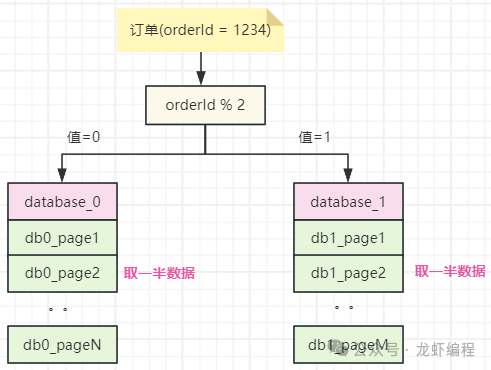 假设现在采用通过订单id取模的策略将订单数据分布到两个不同的库(database_0与database_1)上,如下图所示: