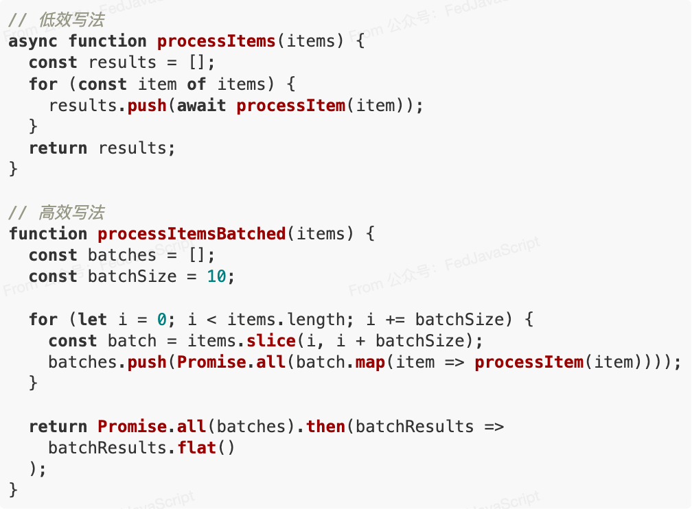 避免不必要的await,改用Promise链式调用可以减少上下文切换: