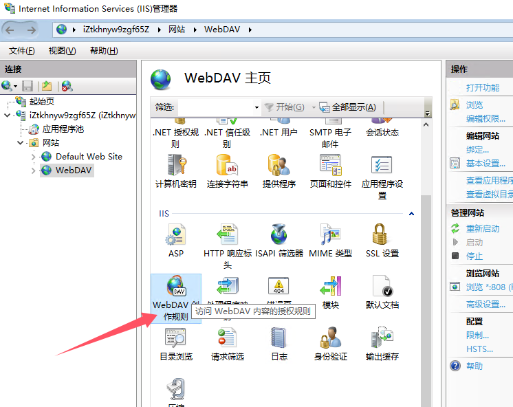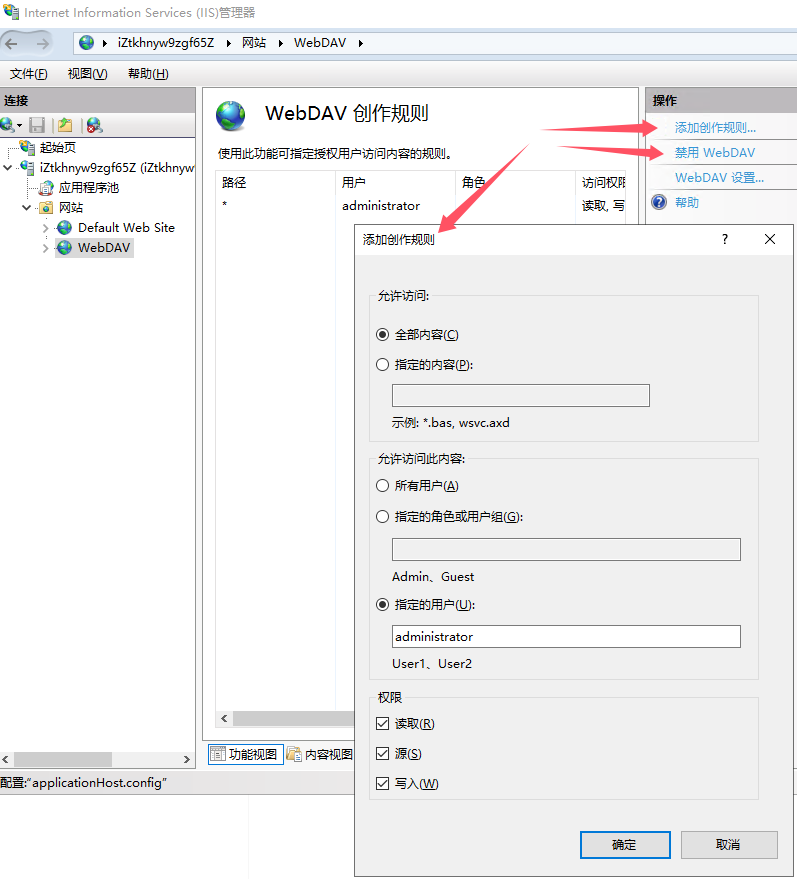 • 选中新建的站点 → 双击 “WebDAV 创作规则” → 在右侧“操作”窗格点击 “启用 WebDAV”