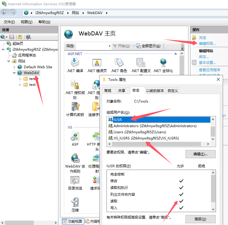 • 右键站点对应的物理文件夹 → “属性” → “安全”选项卡 → 添加 IIS 访问用户(如 IUSR)并赋予 修改/写入 权限。