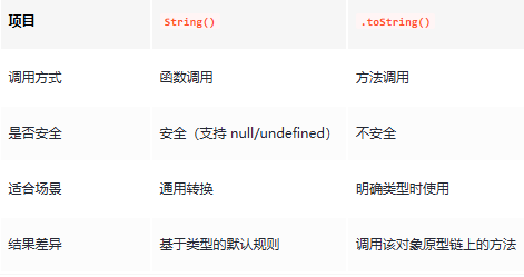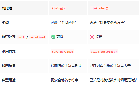 String() 和 .toString() 都是把值转成字符串的常见方式,但它们在 调用方式、可用性、返回结果 上有明显区别。