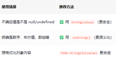它可以安全地转换任何类型为字符串,包括 null 和 undefined。