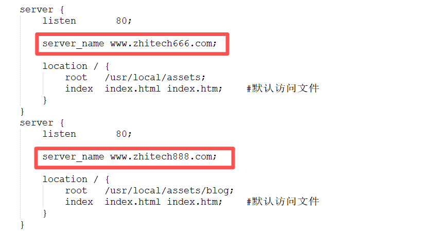 当多个 server 监听的端口号一样时,nginx 会根据设置的 server_name 来获取不同的服务器资源,比如:
