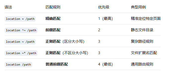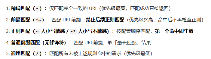 请求路径的开头部分匹配设置的前缀,多个前缀匹配时,路径最长的 location 生效