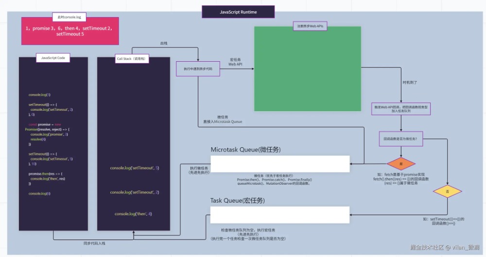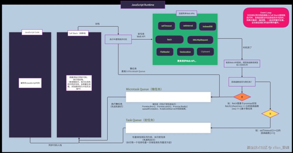 事件循环JavaScript为了处理单线程执行代码时,能异步地处理用户交互、网络请求等任务 (异步Web API),而设计的一套任务调度机制