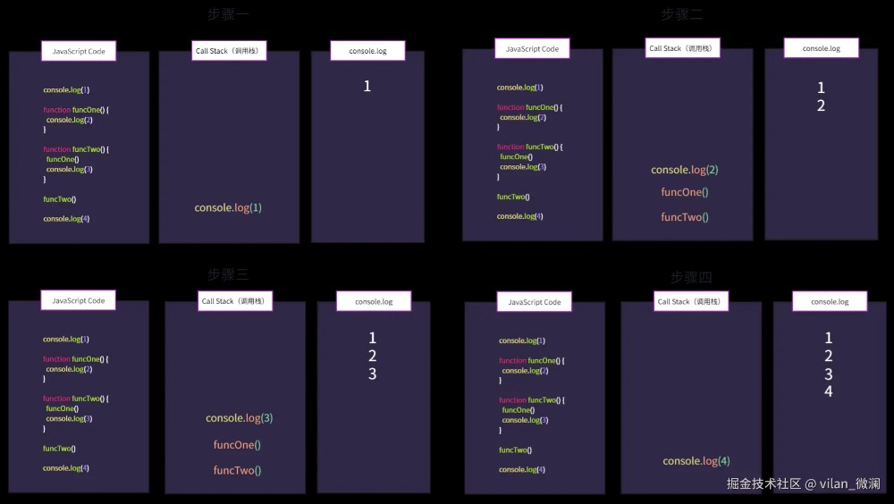 每执行完一个同步任务会把该任务进行出栈。在这个例子当中每次在控制台输出一次,则进行一次出栈处理,直至全部代码执行完成。
