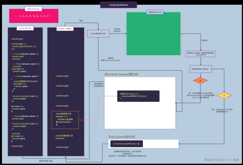 它就像一个永不停止的循环,不断地检查(结合上图就是不断检查Task QueueMicrotask Queue这两个队列)并需要运行的代码。