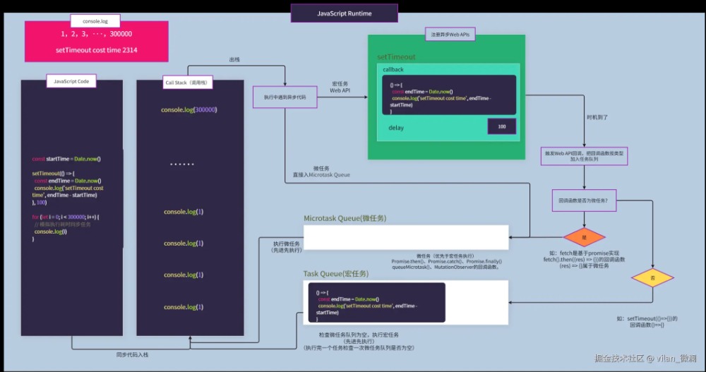 这可能只是简单的JavaScript代码执行事件循环流程,目的也是让大家更直观理解其中原理。实际执行过程可能还会读取堆内存获取引用类型数据、操作dom的方法,可能还会触发页面的重排、重绘等过程、异步文件读取和写入操作、fetch发起网络请求,与服务器建立连接获取网络数据等情况。