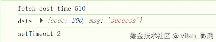 经过多番刷新网页测试,下图控制台打印展示了setTimeout延时为510msfetch请求响应同样是510ms的情况下,.then(data => { console.log('data', data) })先执行了,也是由于fetch基于Promise实现,所以其回调为微任务。