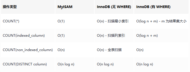 结论:COUNT(*)和 COUNT(1)性能基本一致,COUNT(非索引列)性能最差。 存储引擎差异与索引统计不同存储引擎对 COUNT 的处理方式差异很大: