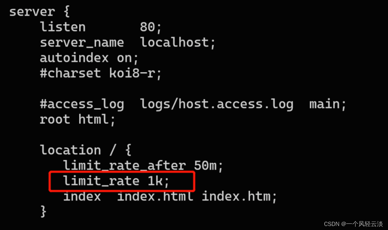 limit_rate 指令是用来操控发送至客户端的数据传输速度的,它可以约束整个衔接的流量,也可以约束单个客户端拜访速度。
