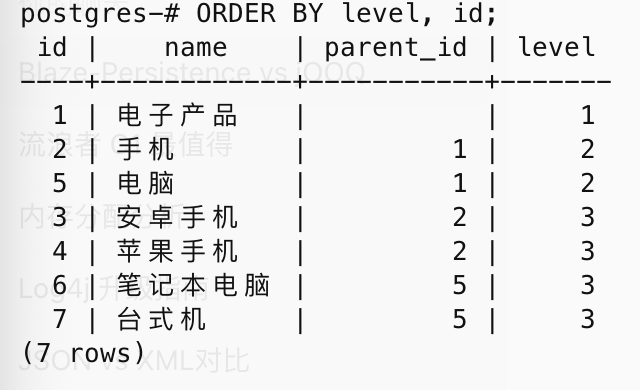 SELECT c.id, c.name, c.parent_id, t.level + 1