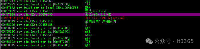 后面看到有个 恭喜恭喜 注册成功。 双击查看反汇编代码