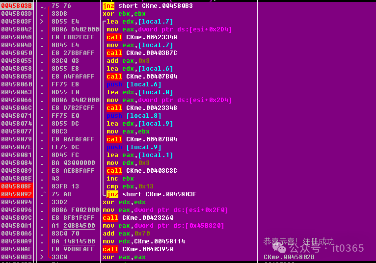0045803B  |. /75 76         jnz short CKme.004580B30045803D  |. |33DB          xor ebx,ebx0045803F  |> |8D55 E4       /lea edx,[local.7]00458042  |. |8B86 D4020000 |mov eax,dword ptr ds:[esi+0x2D4]00458048  |. |E8 FBB2FCFF   |call CKme.004233480045804D  |. |8B45 E4       |mov eax,[local.7]00458050  |. |E8 27BBFAFF   |call CKme.00403B7C00458055  |. |83C0 03       |add eax,0x300458058  |. |8D55 E8       |lea edx,[local.6]0045805B  |. |E8 A4FAFAFF   |call CKme.00407B0400458060  |. |FF75 E8       |push [local.6]00458063  |. |8D55 E0       |lea edx,[local.8]00458066  |. |8B86 D4020000 |mov eax,dword ptr ds:[esi+0x2D4]0045806C  |. |E8 D7B2FCFF   |call CKme.0042334800458071  |. |FF75 E0       |push [local.8]00458074  |. |8D55 DC       |lea edx,[local.9]00458077  |. |8BC3          |mov eax,ebx00458079  |. |E8 86FAFAFF   |call CKme.00407B040045807E  |. |FF75 DC       |push [local.9]00458081  |. |8D45 FC       |lea eax,[local.1]00458084  |. |BA 03000000   |mov edx,0x300458089  |. |E8 AEBBFAFF   |call CKme.00403C3C0045808E  |. |43            |inc ebx0045808F  |. |83FB 13       |cmp ebx,0x1300458092  |.^|75 AB         \jnz short CKme.0045803F00458094  |. |33D2          xor edx,edx00458096  |. |8B86 F0020000 mov eax,dword ptr ds:[esi+0x2F0]0045809C  |. |E8 BFB1FCFF   call CKme.00423260004580A1  |. |A1 20B84500   mov eax,dword ptr ds:[0x45B820]004580A6  |. |83C0 70       add eax,0x70004580A9  |. |BA 14814500   mov edx,CKme.00458114                    ;  恭喜恭喜!注册成功004580AE  |. |E8 9DB8FAFF   call CKme.00403950004580B3  |> \33C0          xor eax,eax                              ;  CKme.0045802B