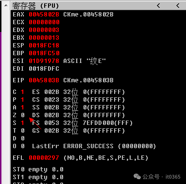 看到这个跳转直接跳过就没了,那么不让它跳我们看看会不会是直接注册成功。在寄存器窗口,找到Z标志,双击它让它变成1