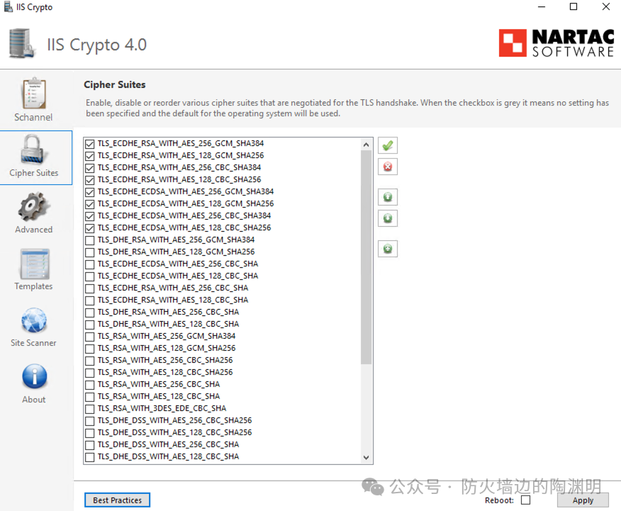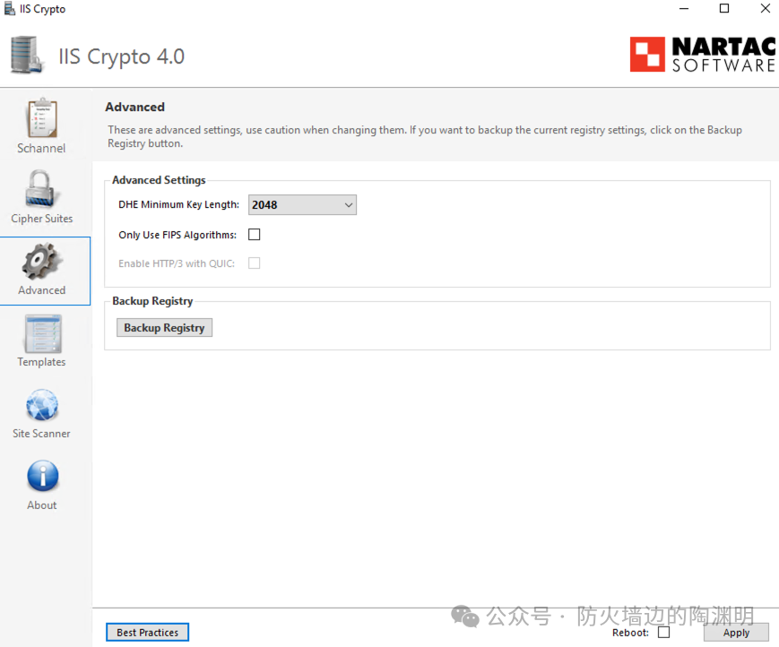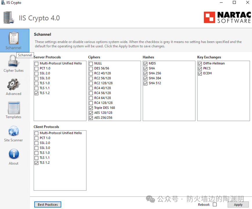 IIS Crypto GUI 是由 Nartac Software 开发的一款免费的 Windows 图形化工具,专门用于配置服务器的加密协议、密码套件和哈希算法。