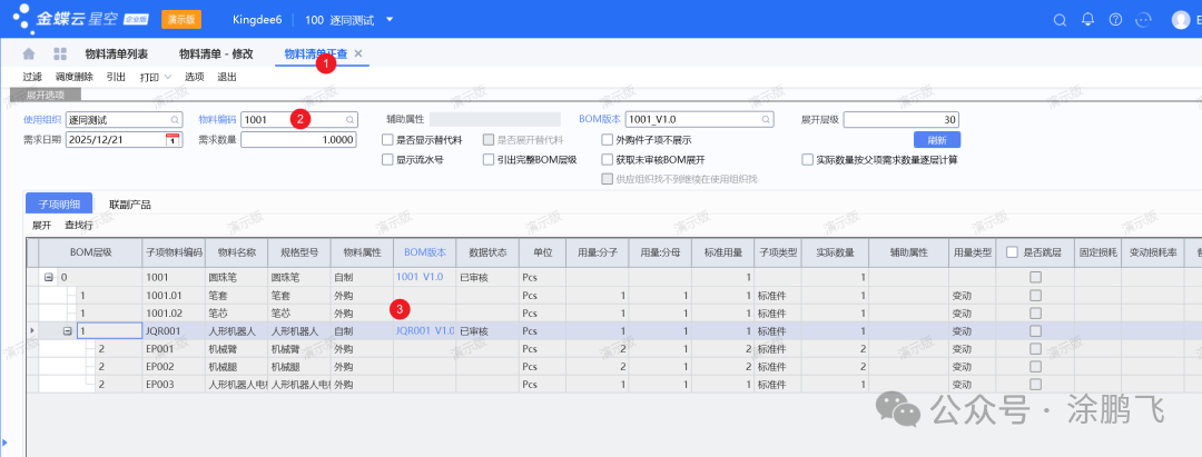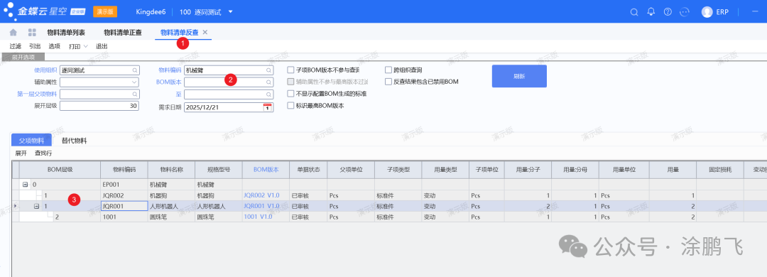 2️⃣选择查询条件,如组织、父项物料、BOM版本、展开层级等,点击「刷新」。