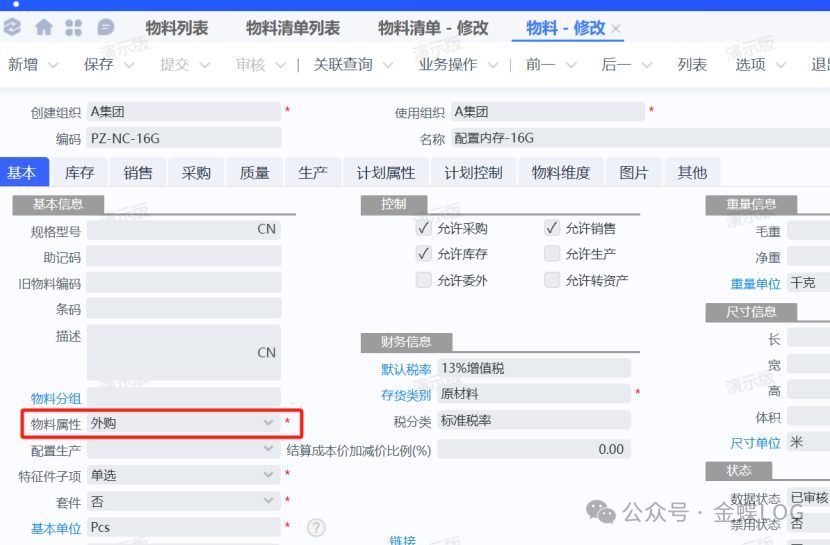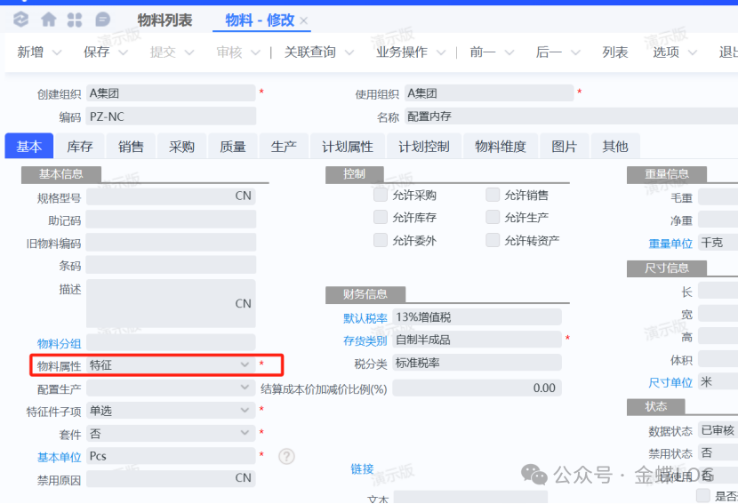 这类物料本身没有具体规格、没有库存、也不用于业务单据,只存在于配置类BOM中,目的是实现“多选一”的选项功能。 第三步:创建实际型号的料号 上面我们创建了特征类的物料——配置内存,这个内存下面有对应的具体的型号;如8G,16G,32G;现在就将这些物料统一创建。物料属性选择外购,当然也可以是自制。