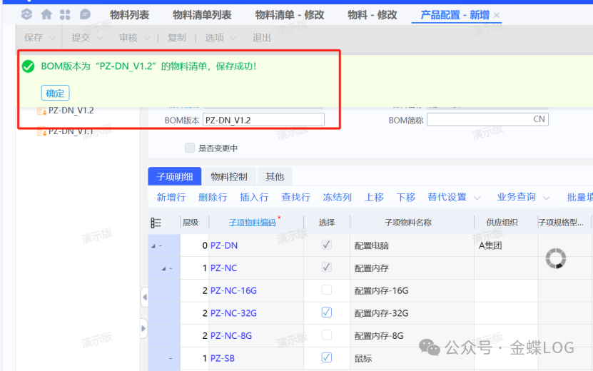 在选配完之后,点击左上方保存,系统便会自动生成一个新的版本号BOM。