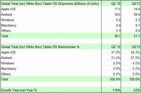 Strategy Analytics认为Android手机继续高歌猛进有三个原因: 强劲的市场需求,发达国家和发展中国家的需求都很旺盛。 全价格覆盖,在竞争中有价格优势。 有一个庞大的应用商店。 相比Android手机,iOS手机和Windows Phone手机同比的出货量增长就相对平稳一些,在Android手机和WP手机市场占有率都在上升的情况下,iOS手机市场份额反而有所下降,由去年2季度的16.6%降至了13.6%,这也是自2010年2季度以来的最低点。而WP手机的辛勤开垦则基本上由诺基亚带动,至少WP手机在市场已经算是立足了。 说如今智能手机市场是三足鼎立则有些偏颇了,从占有率上看,WP手机还无法跟前两位相比,而至于利润来说,更是苹果和三星垄断的局面。Strategy Analytics分析师Linda Sui认为WP手机需要解决两个问题: WP手机的费用(授权费)要能和低端Android手机竞争。 WP手机需要加强对最新硬件的支持,目前已经整体落后于Android手机(除了拍照)。 除了智能手机领域之外,Android在平板上也是奋起直追,由去年2季度和iOS平板平分天下的状况,变成今年的独占近七成。而iOS平板出货量本来就下降了,在加上Android平板的稀释,在平板市场的份额就顺理成章的下降了。