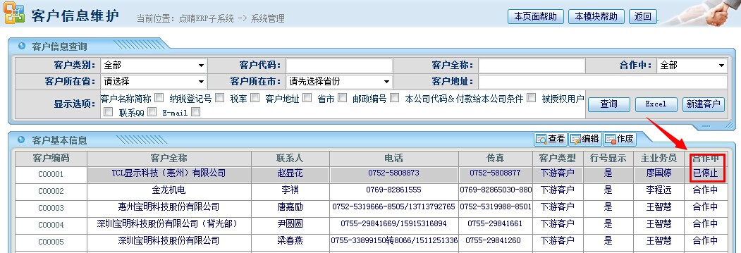 原因:启用了新增客户审核功能,启用此功能新增的客户的显示状态会显示不合作,如图: