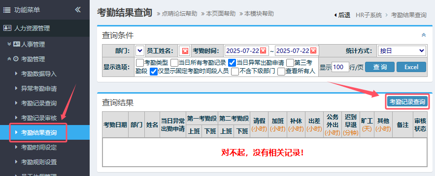 云考勤的结果可以在手机APP(/微信版)上的“浏览考勤记录”(见上),或者WEB版OA的如下位置查看: