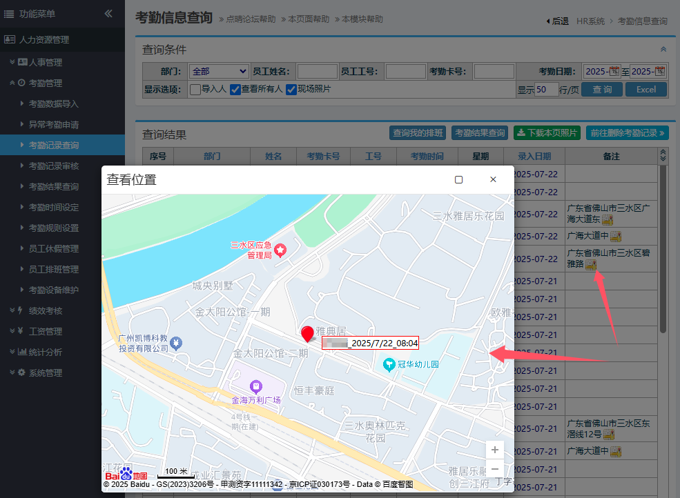 手机APP云考勤这个功能是用于外勤出差人员考勤,无法限制具体地点,人事专员在审核考勤记录时,人工判断考勤地点是否正确。